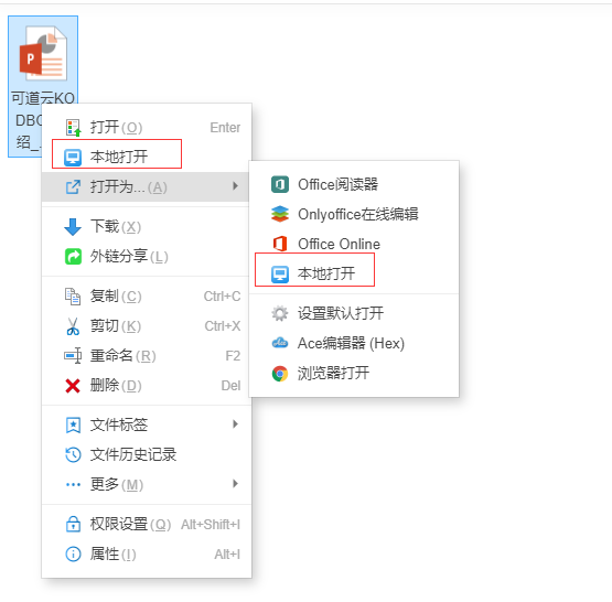 选定单个文件后,如:ppt、word、excel、图片等;右击选择本地打开,也可自定义“设置默认打开”方式后,双击直接打开。