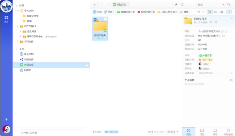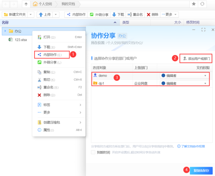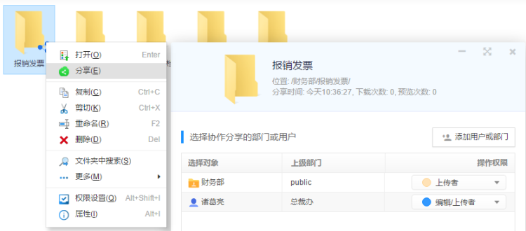 · 内部协作分享:由于部门与部门之间相互隔离,跨部门协同可通过”文件协作分享“功能与指定用户(组)来建立沟通管道