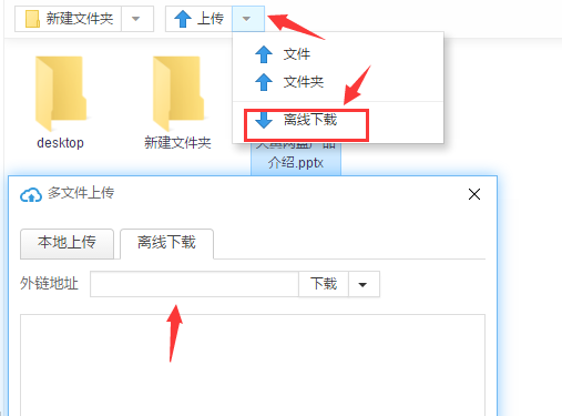 在网盘页面点选”上传“按键下拉菜单,点击”离线下载“,填入待下载文件的http链接,可以实现离线下载。