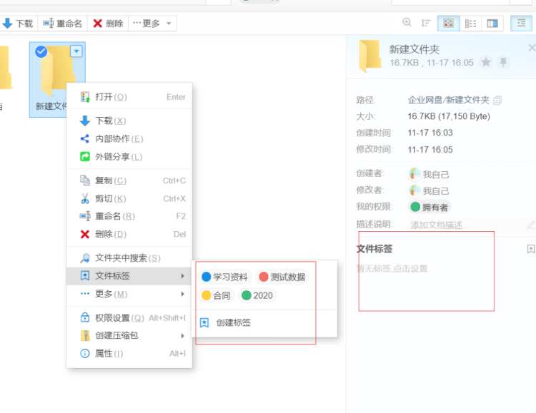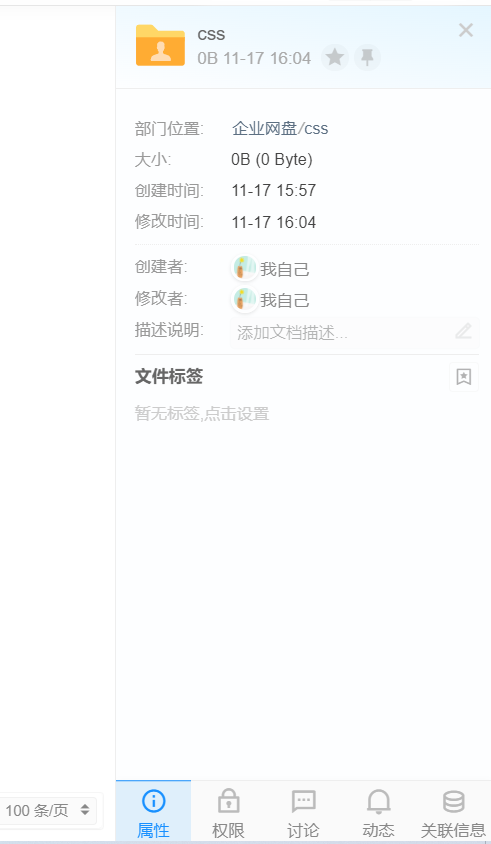 · 属性:主要告知文件的基本信息,包含大小,文件数,创建者/修改者,个人备注以及标签