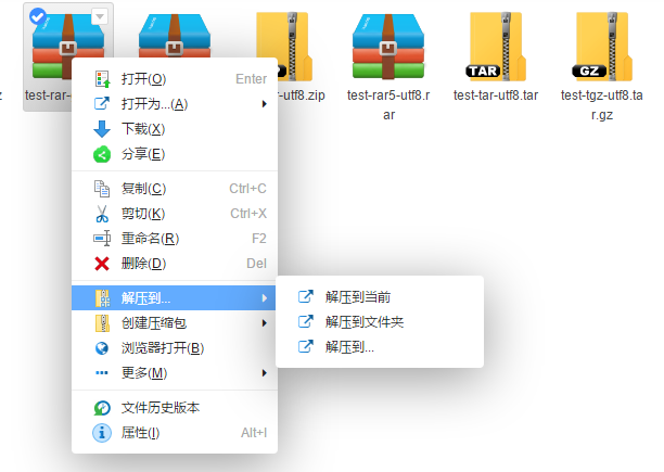 选中压缩文件包后,右击菜单可以选择对文件进行在线解压操作。
