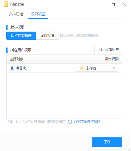· ”保持原有权限“:除指定用户(组)外,其他用户将默认继承上级文件(夹)权限。