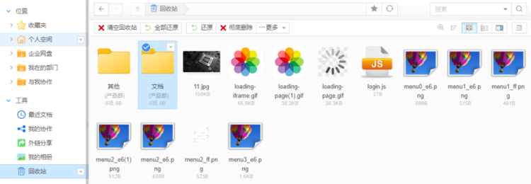 点击进入“回收站”,可以看到被删除的文件/文件夹,可以进行“清空回收站”、“彻底删除”、“还原”等操作。注意,在回收站里的文件被删除后,将被彻底删除。