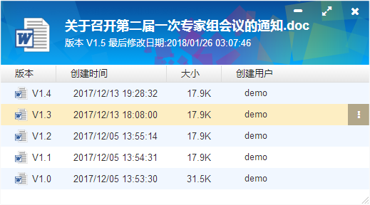 · 历史版本:文件所有的修改记录,包含修改人以及修改时间、修改后版本