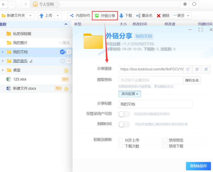 内部协作分享分配给其他人的权限最多可配置项,基于自己当前在该目录的权限。